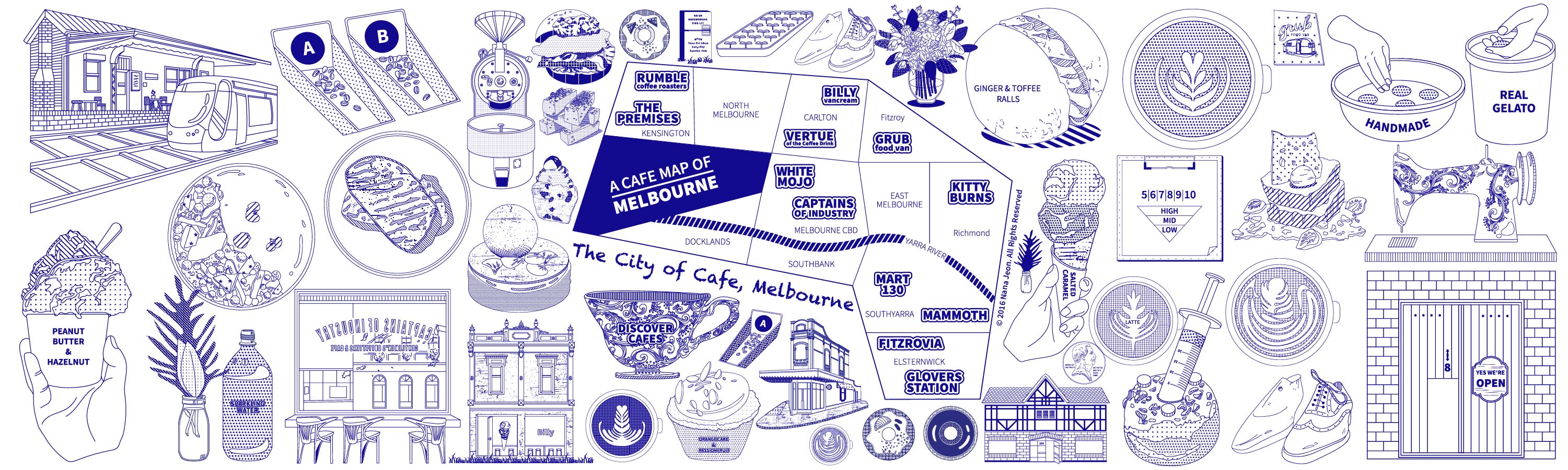 The Discover Cafes Project is to introduce 12 hidden cafes in Melbourne. Melbourne is the best city of Arts in Australia. So I focused on designing the identity of Melbourne such as antic patterns, unique drawings and creative graffiti. I also developed this website using HTML, CSS and JavaScript, especially SVG drawing.